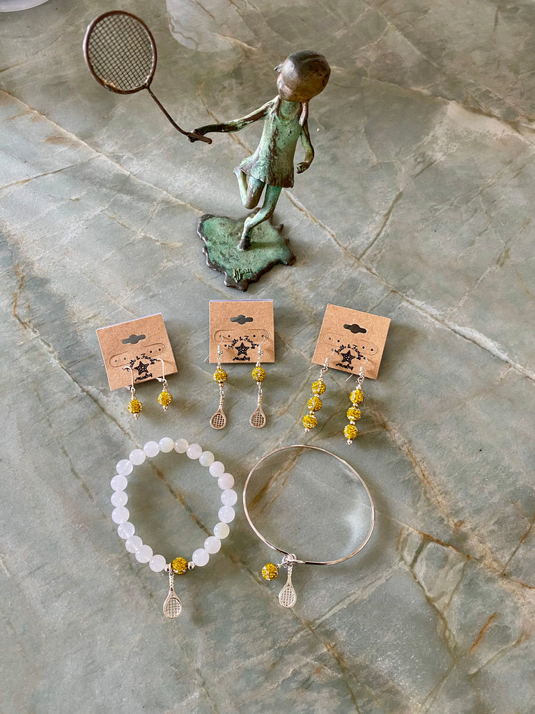 Fun and elegant, this .925 Sterling bracelet features a 10mm pave crystal tennis ball and sterling silver tennis racquet hanging from the loop on top.  One size fits most, at 7" in diameter.