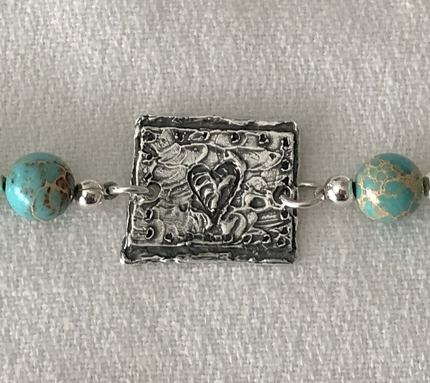 A sterling silver, hand cast focal heart charm is the centerpiece for this simple, yet elegant bracelet.  Shown in Turquoise, this bracelet can be constructed with your choice of semi-precious gemstone.  Please request gemstone color and bracelet length.