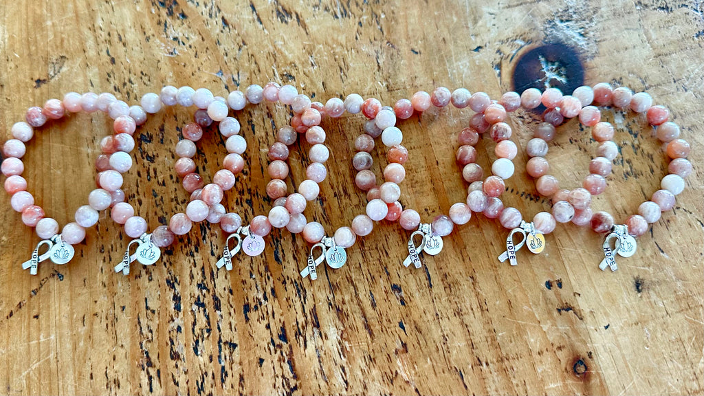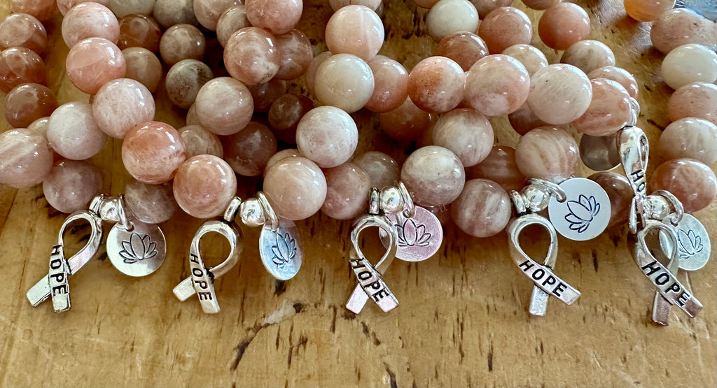 Yoga Cancer Support Bracelet Friends & Family, Wear this bracelet in support of your favorite Yogi battling Cancer. This bracelet is hand strung with stunning Sunstones, and adorned with a sterling hand-stamped Lotus Flower charm and cancer ribbon. It is available in 3 sizes... Small is meant for petite wrists. Medium is most universal for women or men with smaller wrists. Large is for most men, and for those who like to wear their bracelets a little looser. Custom orders of any gemstone color are available... Just contact us, and we'll get it done for you!