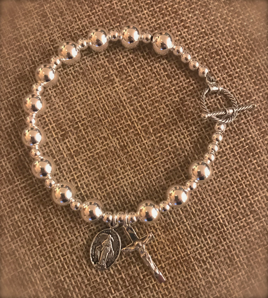 In the proper configuration, this Sterling Silver Rosary Bracelet contains one Decade of 10 beads, Crucifix and Center Medal, a sterling silver Our Father Bead, 3 Hail Mary Beads and one sterling silver Glory Be Bead. A Sterling Toggle Clasp makes this bracelet easy to put on.