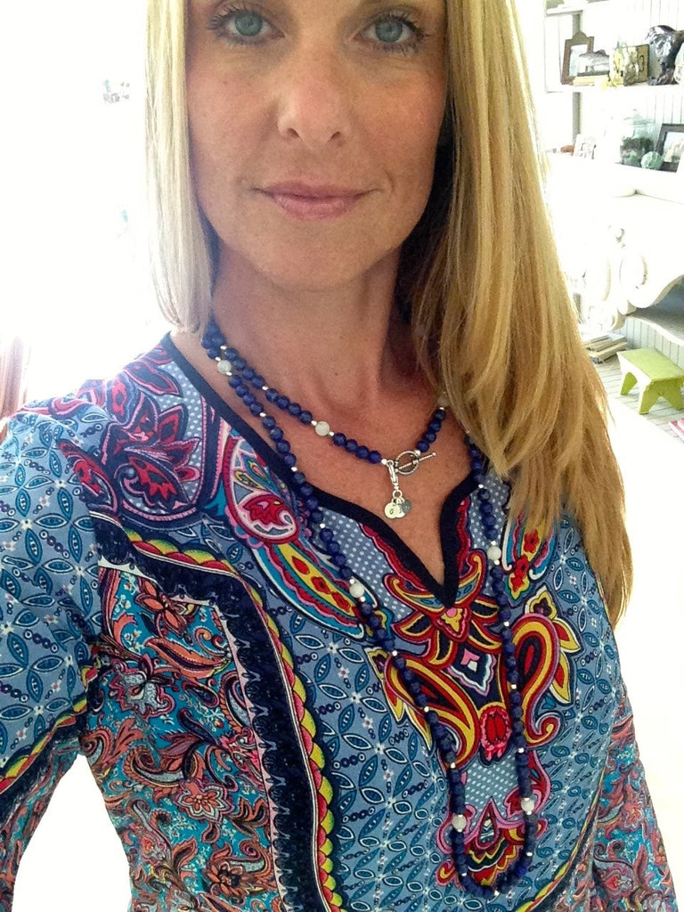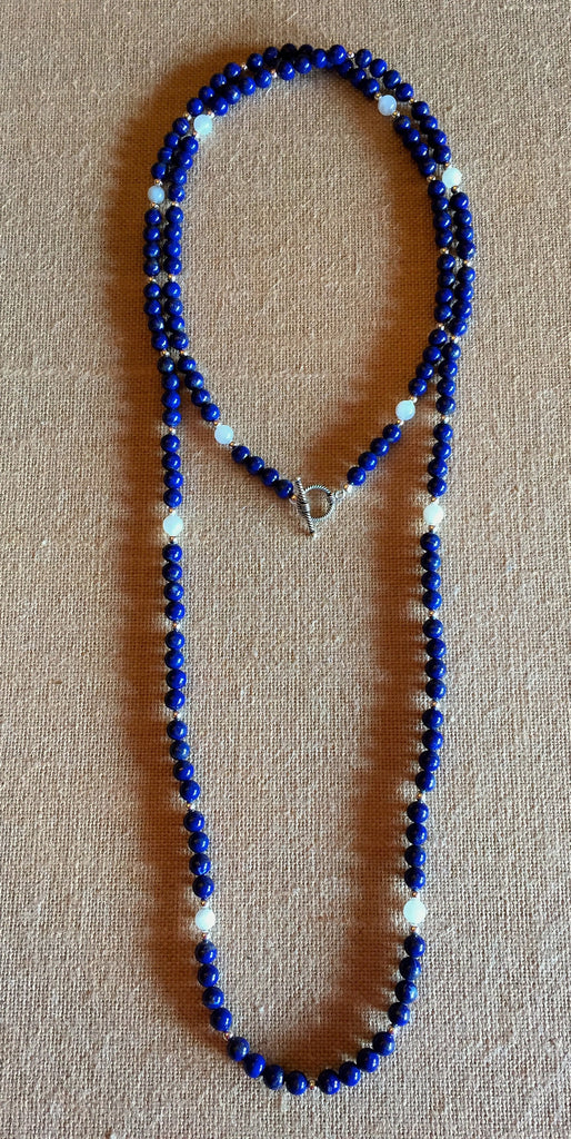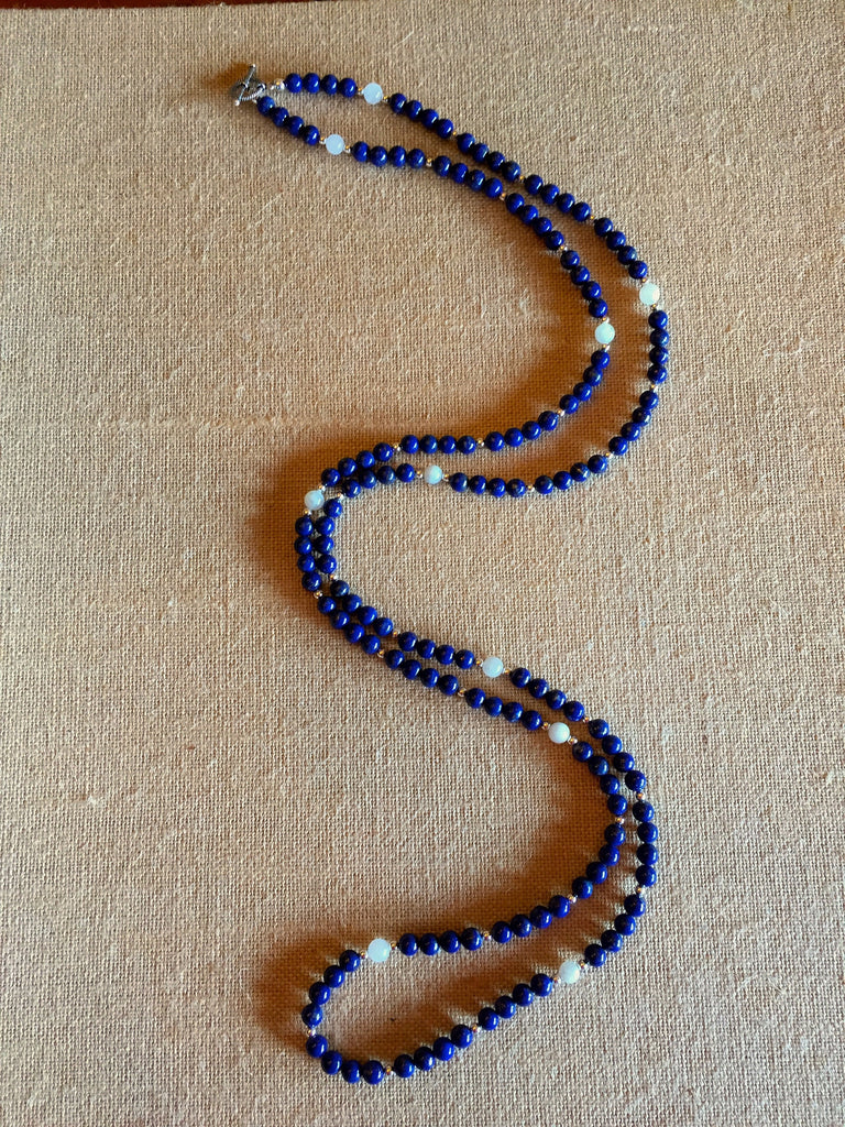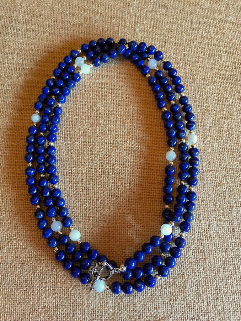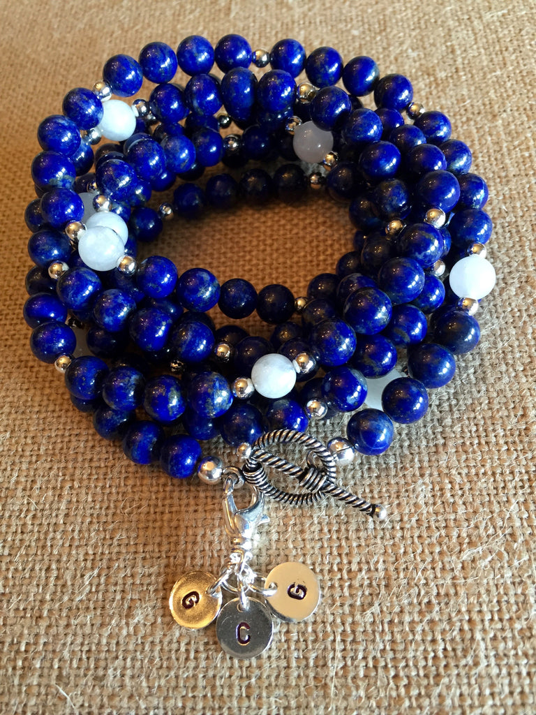 Beautiful Blue Lapis, Milky Moonstone & Sterling Necklace with Sterling Initial Charms.  Wear as a single, double or triple necklace, or as a wrap statement bracelet.  Also available with Gold Vermeil.  Would you like a different color stone?  I'll bet we have it.  Just ask!