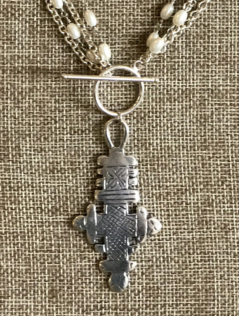 This gorgeous, substantial Ethiopian cross hangs from a sterling toggle clasp, which allows it to be worn long (approx. 40") or doubled (approx. 20"). The cross measures 65mm tall x 35mm wide. Shown hanging from a pearl chain, combined with a sterling chain, this piece is a substantial and versatile addition to your collection. Customization of length and/or type of gemstone chain is available upon request.