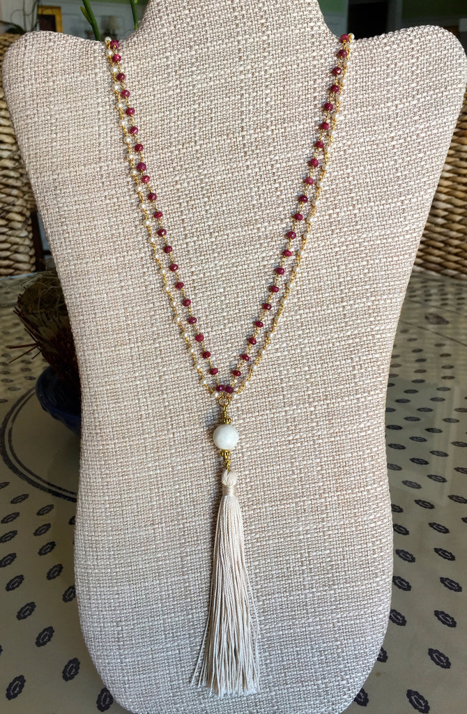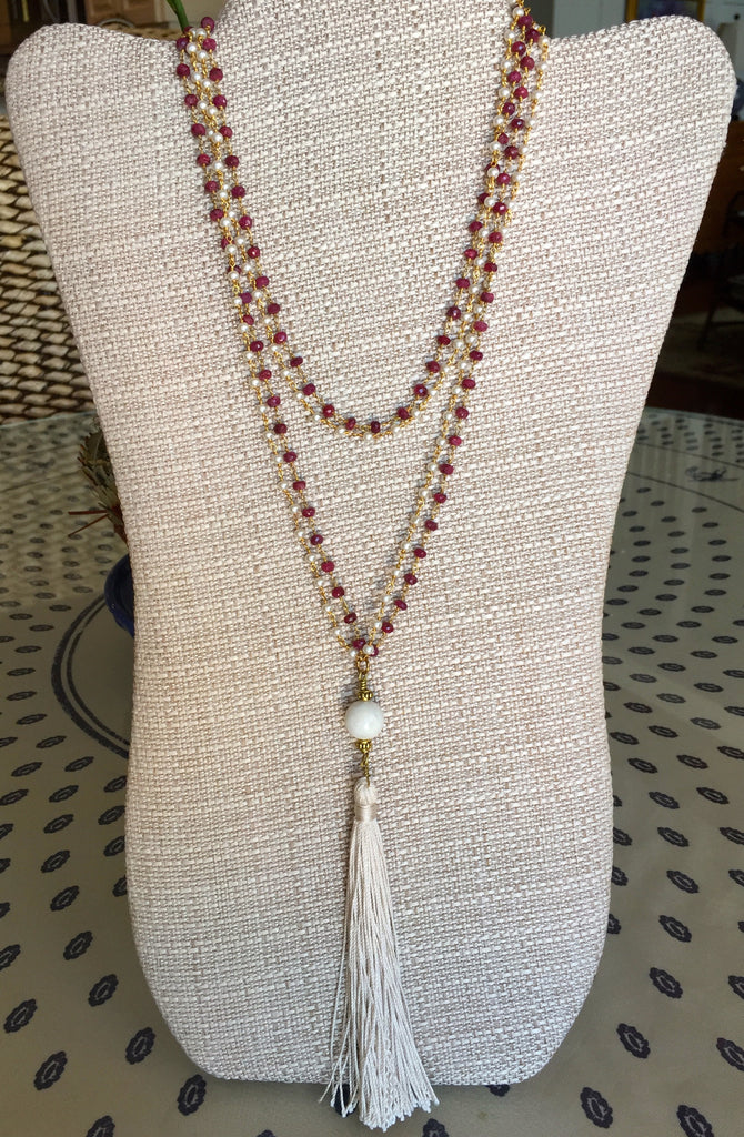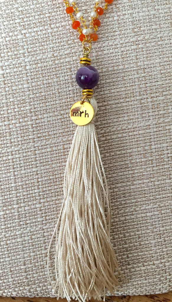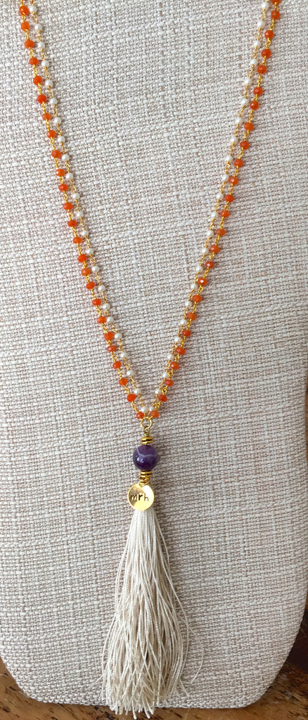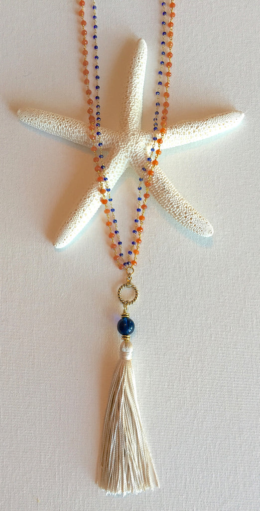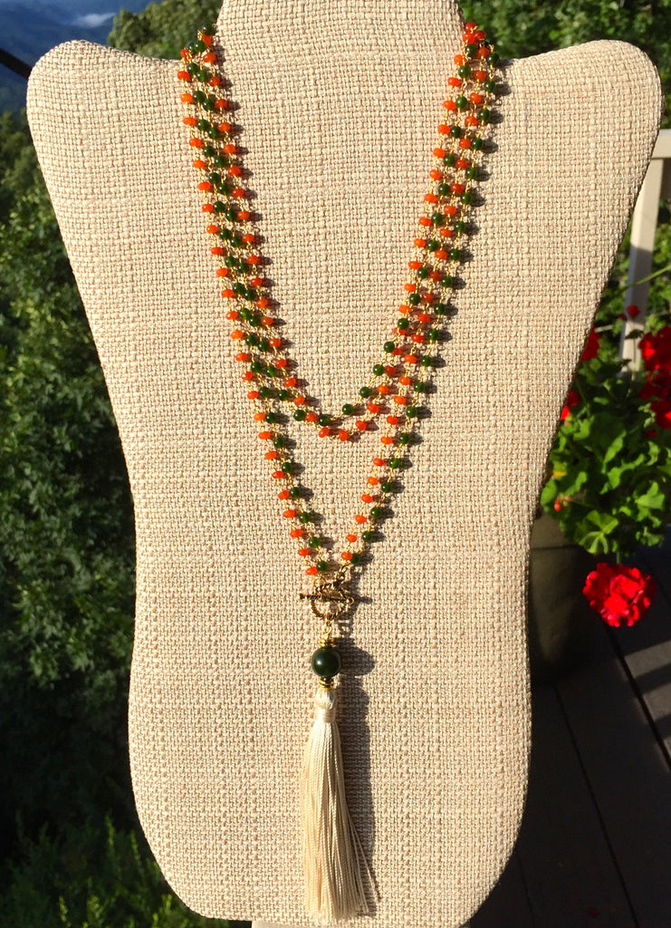 Go Team!  This colorful necklace is comprised of two strands of gemstone rosary chain in your team's colors, accented with a large focal gemstone and handmade silk tassel.  This necklace measures 36" in length when worn long, not including the tassel, but it can also be worn doubled.  If you don't see your colors or need to customize your length, just contact us, and we'll take care of you.