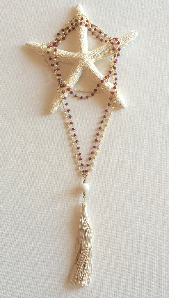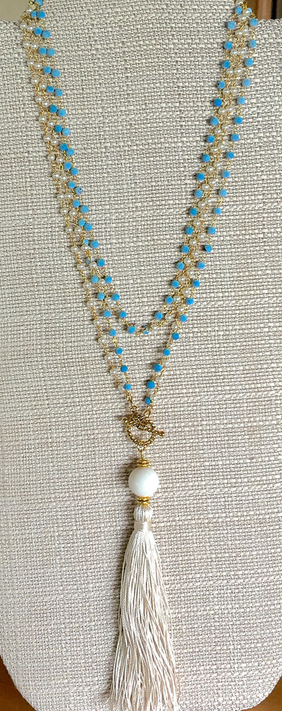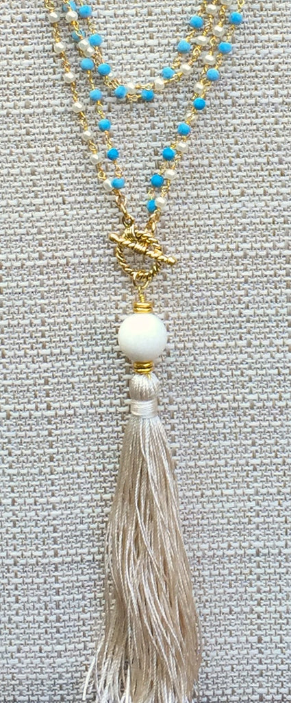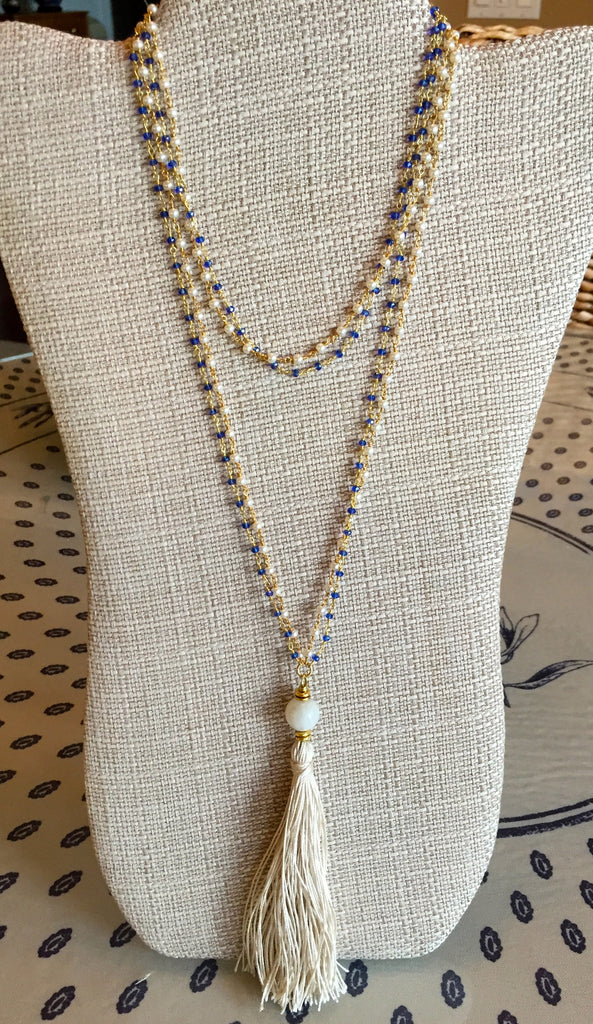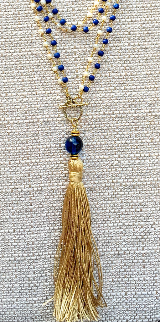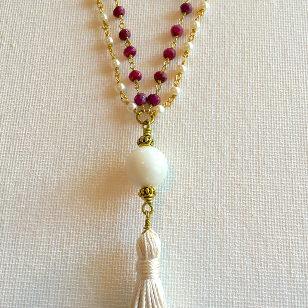 Go Team!  This colorful necklace is comprised of two strands of gemstone rosary chain in your team's colors, accented with a large focal gemstone and handmade silk tassel.  This necklace measures 36" in length when worn long, not including the tassel, but it can also be worn doubled.  If you don't see your colors or need to customize your length, just contact us, and we'll take care of you.