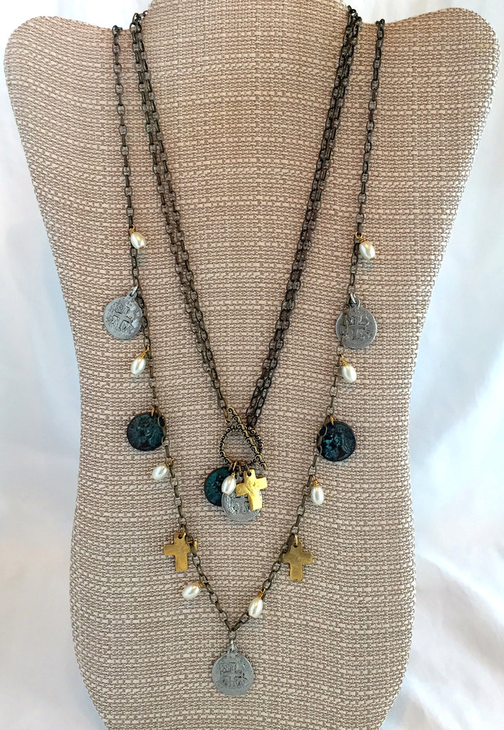 From the "Enduring Faith" Collection of Necklaces, Earrings & Bracelets, this necklace is adorned with multiple silver, antiqued copper and gold coins and crosses, together with hand-wired freshwater pearls. Wear long (36 inches), or doubled. Available in either bronze and gold-tone chain. Shown layered with, "Enduring Faith Necklace - Long/Short" in 2nd photo (not included, but available).