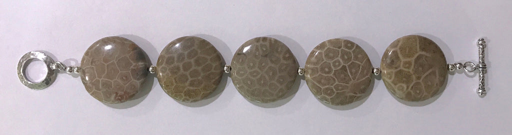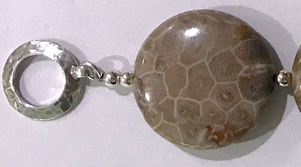 This elegant Petoskey Stone bracelet is constructed with rare, Grade A, 30mm Petoskey Stone beads, which are polished smooth and flat, to maximize their magnificent fossil patterns. This bracelet is accented with sterling silver beads, and a Sterling Silver artisan hammered Sterling Silver toggle clasp. As with all of our pieces, we'll gladly add a small cross at no additional charge. By the way, I made myself one, and it is very comfortable!