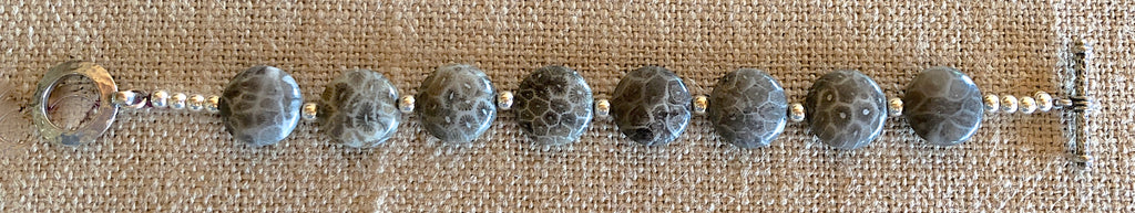 This elegant Petoskey Stone bracelet is constructed with rare, Grade A, 15mm Petoskey Stone beads, which are polished smooth and flat, to maximize their magnificent fossil patterns. This bracelet is accented with sterling silver beads, and a Sterling Silver artisan hammered Sterling Silver toggle clasp. As with all of our pieces, we'll gladly add a small cross at no additional charge.