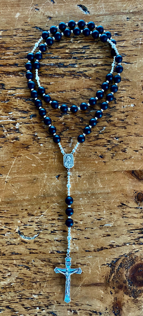 Classic Catholic Rosary made with Matte Black Obsidian, Sterling Silver and an Sterling Silver disk charm with the owner's initial(s). We will happily make a rosary for you out of the color of stone, and metal you choose. If we don't offer the type of stone you are looking for, please contact us, and we'll happily work with you!