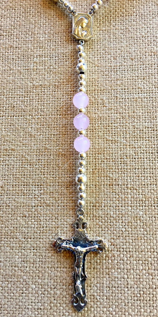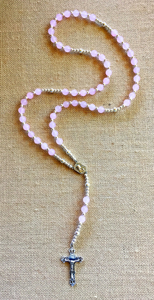 Handmade Breast Cancer Rosary with Sterling Silver Crucifix and Center Medal is constructed of Pink Jade gemstones and Sterling Beads.  Choose Sterling Cancer Ribbon and/or Initial Charm.  Whether it be to encourage, to honor or to remember a loved one, this rosary is the perfect way to amplify the power of prayer for that one you love.
